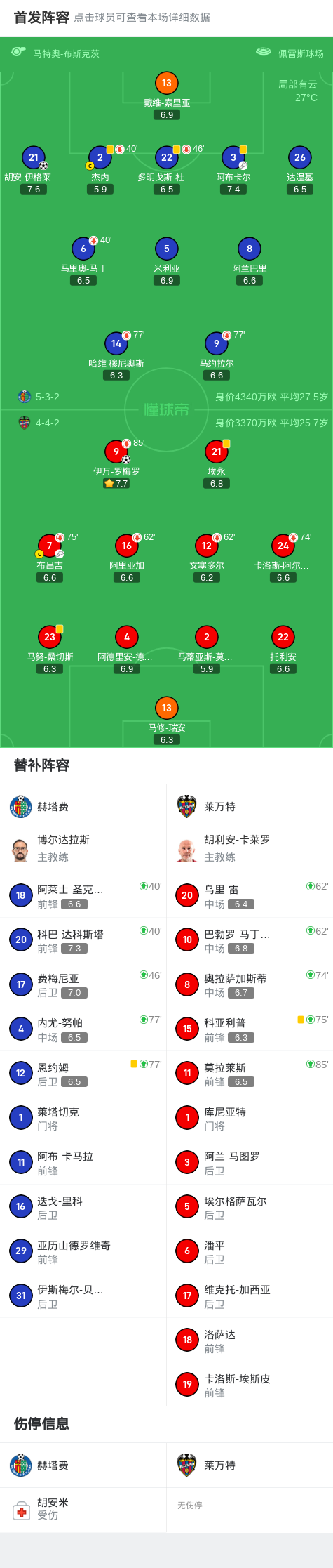北京時間9月27日,西班牙足球甲級聯(lián)賽第7輪 角逐,赫塔費坐鎮(zhèn)主場迎戰(zhàn)萊萬特。比賽過程中,萊萬特率先打破僵局,布呂吉送出助攻,伊萬-羅梅羅完成破門。此后赫塔費 反擊,阿布卡爾精準(zhǔn)傳球助胡安-伊格萊西亞斯扳平比分。雙方均未能再度改寫比分,最終以1比1握手言和。