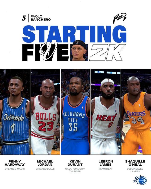 魔術(shù)隊(duì)官方Instagram列出班凱羅的選擇,他的2K首發(fā)五人組分別是:“便士”哈達(dá)威、邁克爾-喬丹、凱文-杜蘭特、勒布朗-詹姆斯和沙奎爾-奧尼爾。