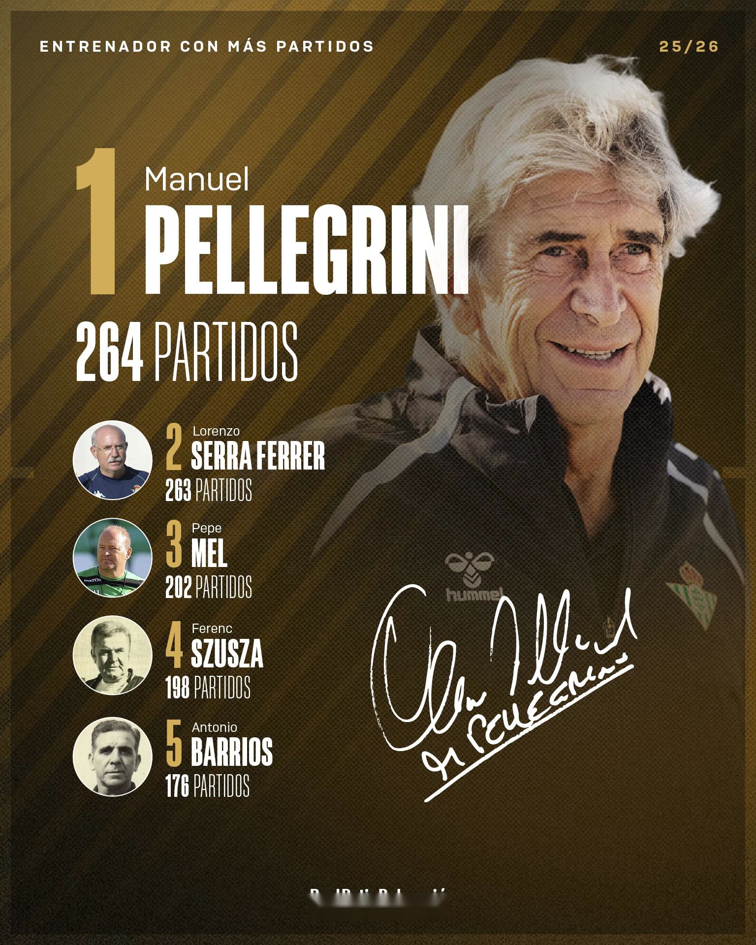 在執(zhí)教貝蒂斯的前263場比賽中,佩萊格里尼率隊取得了123勝68平72負的成績,并且贏得過21-22賽季國王杯的冠軍。
