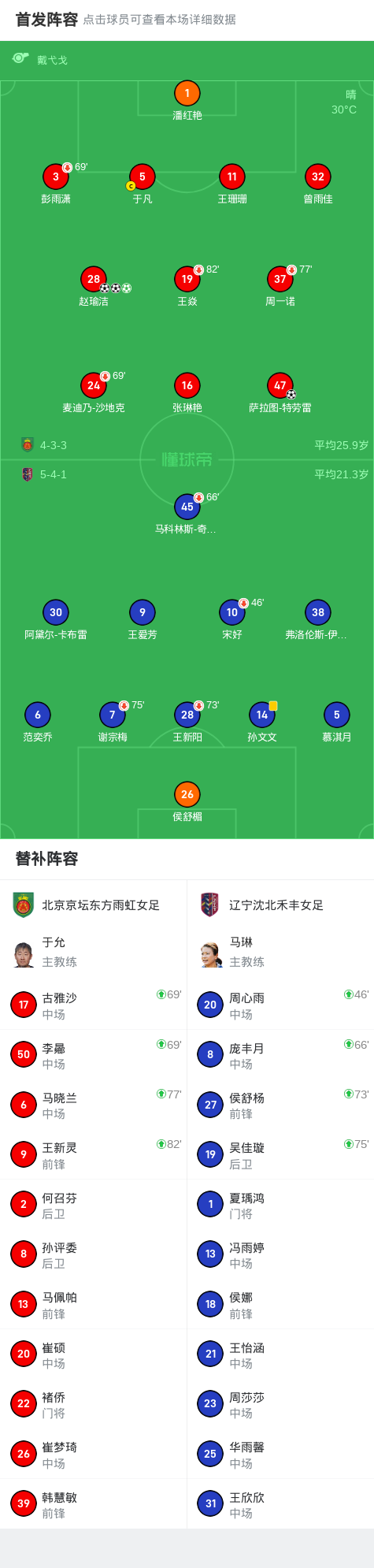 本輪之前,排名第一的遼寧沈北禾豐女足積分為40分,第二名的北京東方雨虹女足積分為38分,本賽季聯(lián)賽最后一輪兩個爭冠對手直接相遇。最終,北京雨虹女足憑借趙瑜潔帽子戲法和薩拉圖-特勞雷的破門,以4-0大勝遼寧沈北禾豐女足,積分榜反超對手1分,奪得了本賽季女超聯(lián)賽冠軍。